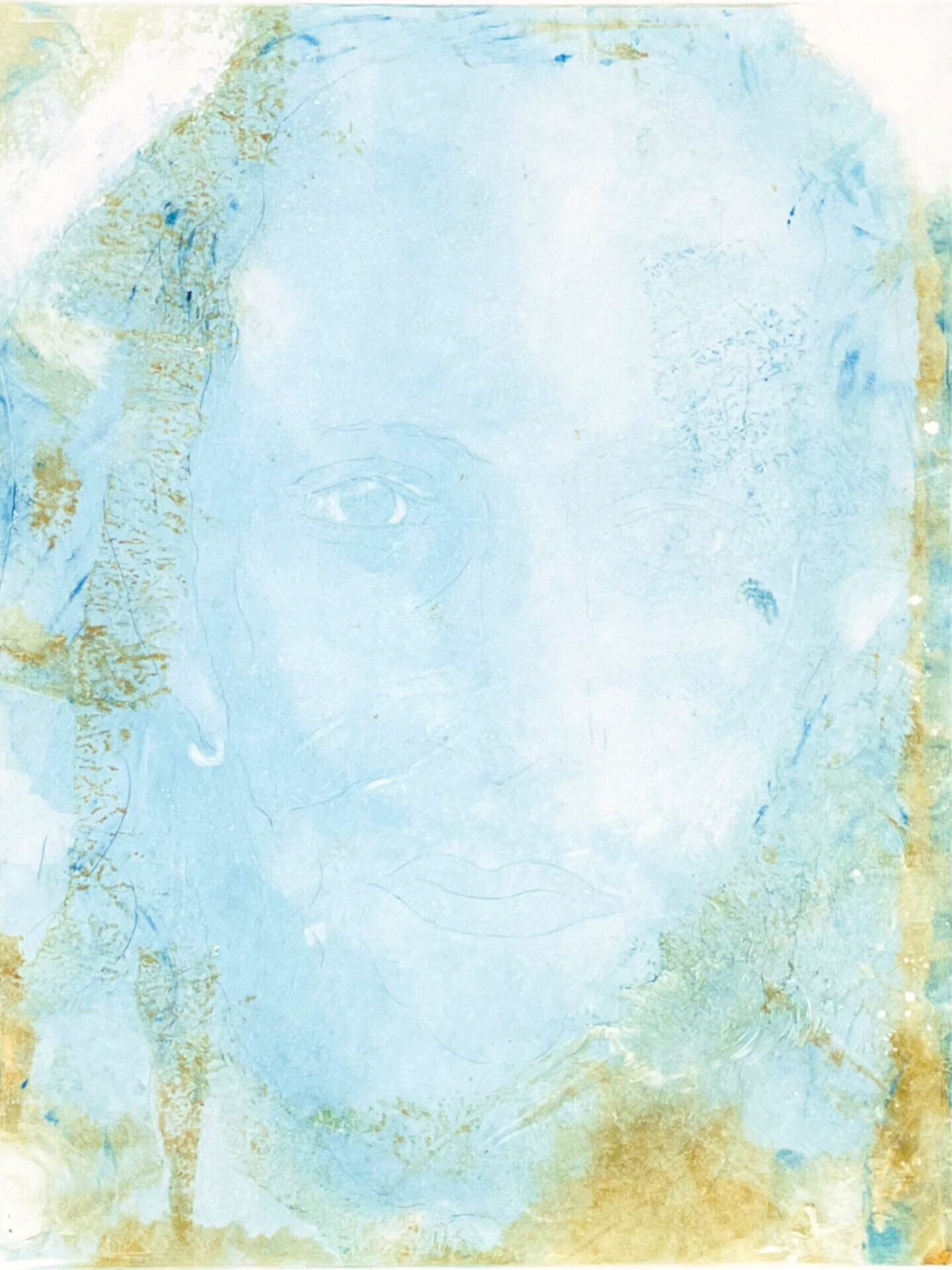 Dans ce monotype présenté entre lattes de bois, je me suis interrogée sur l'essence de l'être. L'image centrale qui nous regarde nous invite à une reflexion intérieure.
